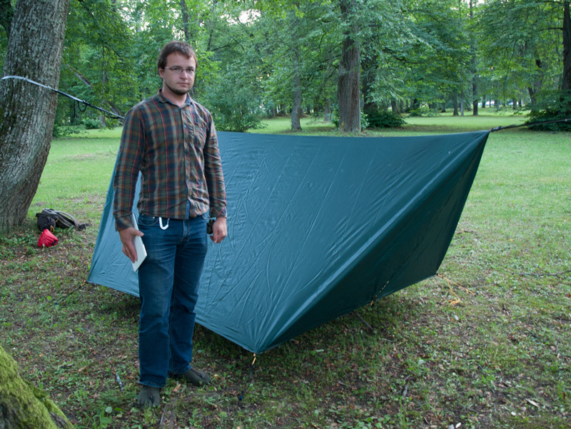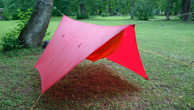 Kuusnurkne põhiplaan tagab kerge kaalu juures vihmakindla ala, mille alla mahub nii rippvoodi kui rippvoodi omaniku varustus.
